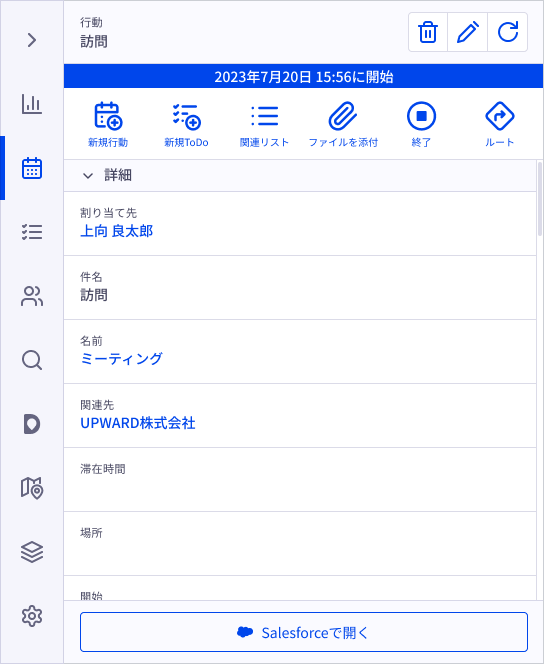[行動詳細パネル]では、行動の開始・終了や、ファイルの添付を行います。