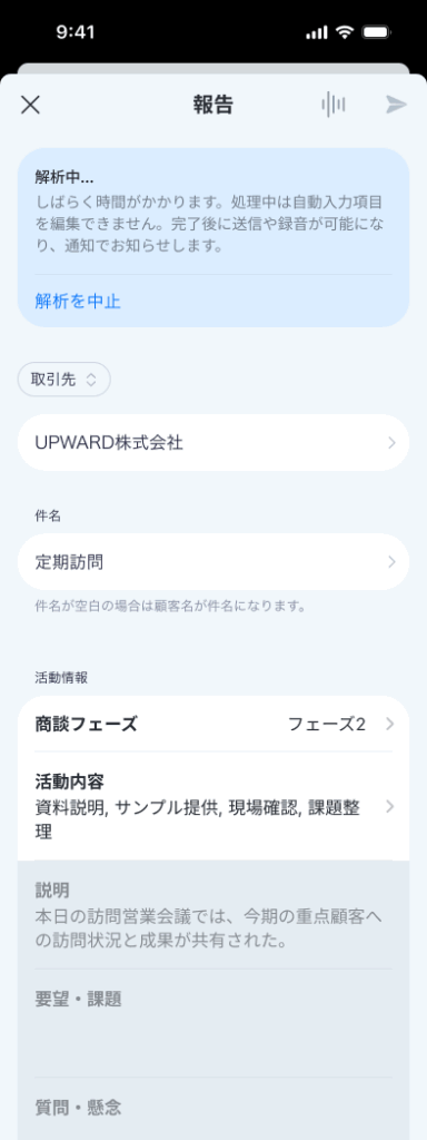 また、音声解析処理による自動入力の対象項目は編集不可となり、それ以外の項目は手動での編集が可能です。